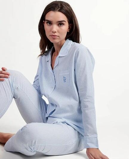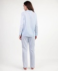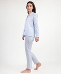 * Åben pyjamas i poplin-stof, lange ærmer, reverskrave og lange bukser, i to farvekombinationer: blå og pink.