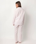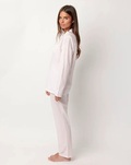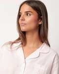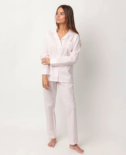 * Åben pyjamas i poplin-stof, lange ærmer, reverskrave og lange bukser, i to farvekombinationer: blå og pink.